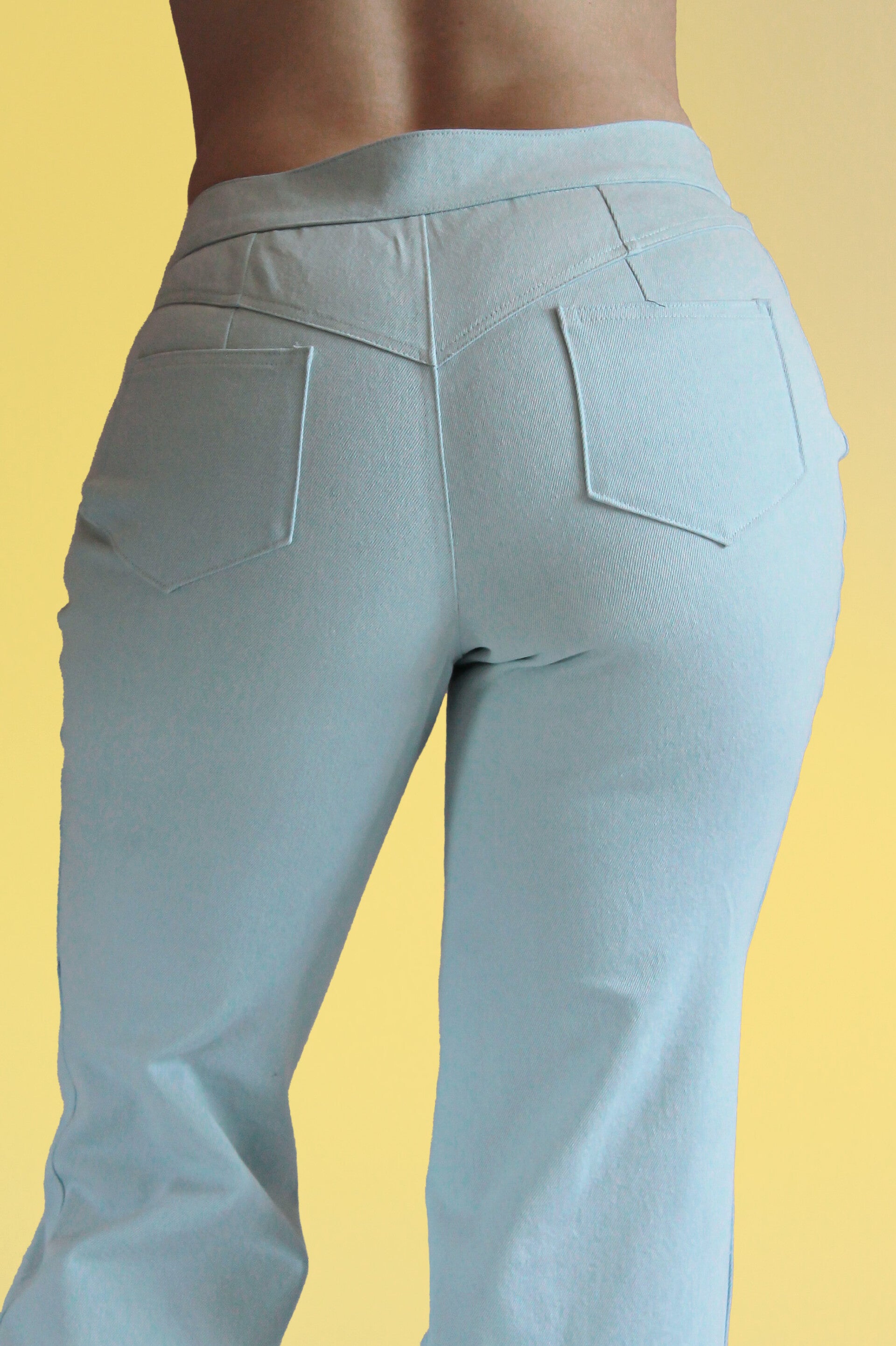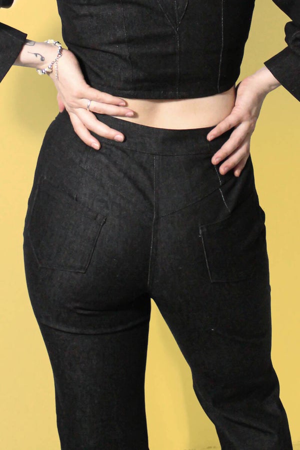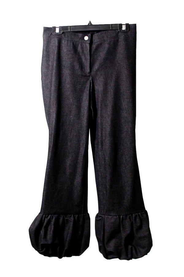 Byxor med “puffben” i denim. FIONA är vår tappning på ett par klassiska jeans. Den stora puffen vid bensluten gör att byxorna får en unik silhuette med både elegans och komfort. Hög midja, raka ben och sydda i material med skön stretch. Ok samt två fickor baktill.